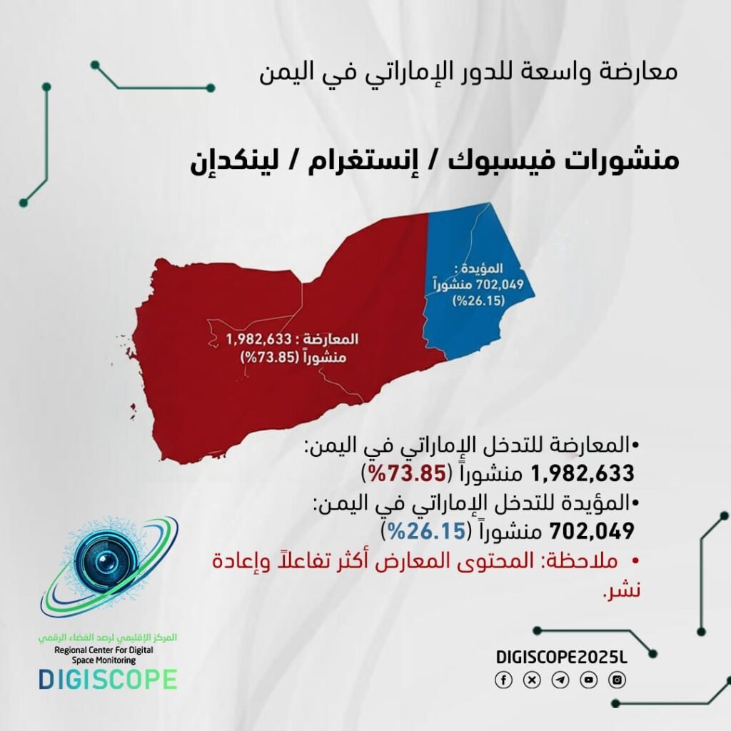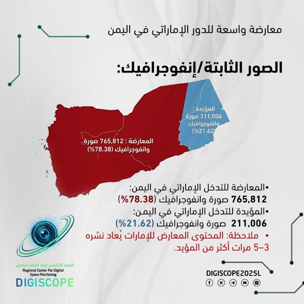 • المحتوى المعارض للتدخل الإماراتي: يهيمن على المشهد الرقمي، ويحقق انتشاراً أكبر وتفاعلاً بصرياً ومشاهدة أعلى، خاصة في الفيديوهات القصيرة والإنفوجرافيك.